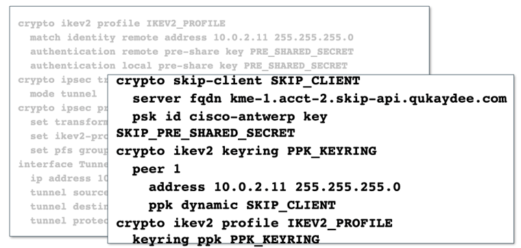 The configuration (pictured in the background in gray above) is the configuration required for any IPsec tunnel. In black (at the front) is the additional configuration for enabling QKD. Essentially this process is as simple as indicating the need to use QKD and entering some information to identify how to reach the QKD device to get the key.